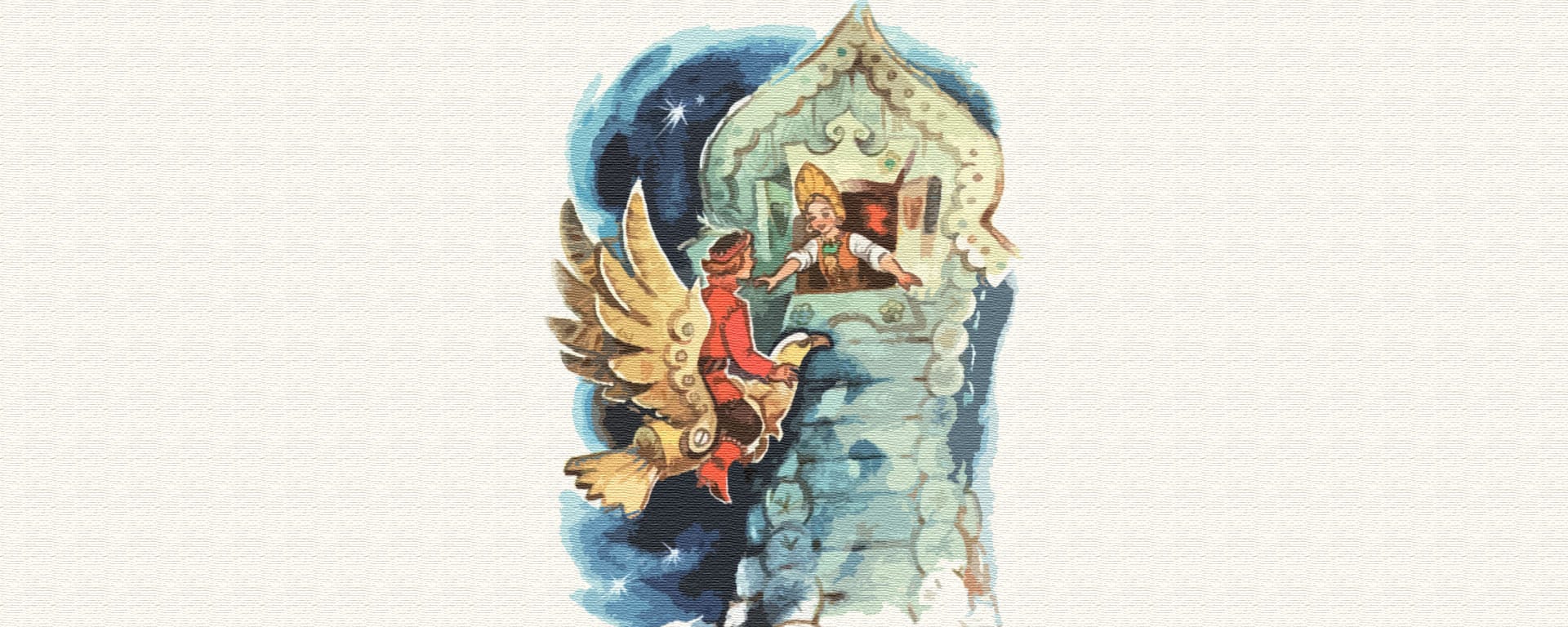На другой день, как стемнело, сел он на своего деревянного орла, взвился в облака и полетел к башне с той стороны, где окошко в тереме было.