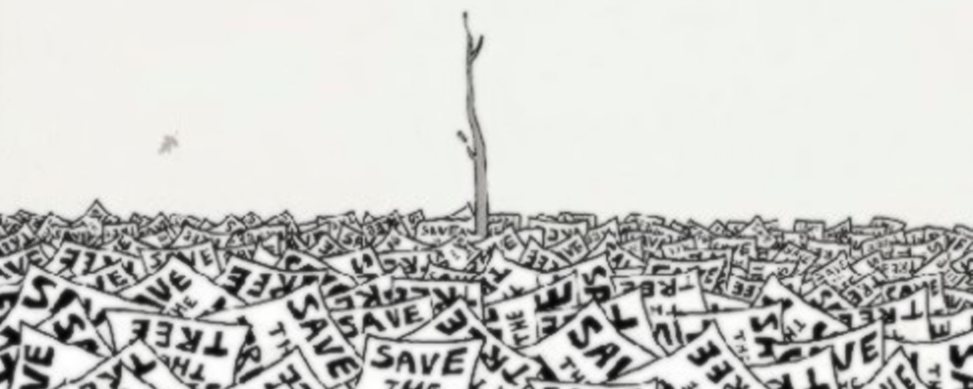 Арт о лицемерном отношении к природе: последнее дерево усыпано бумажными листовками с призывом «сохраним деревья».